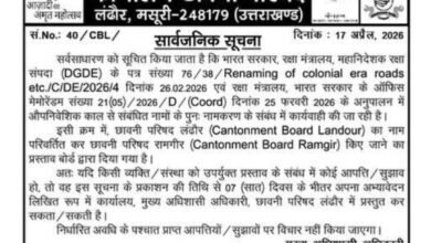देहरादून , जन केसरी । छावनी परिषद लंढौर का नाम बदलकर “छावनी परिषद रामगीर” किए जाने का प्रस्ताव सामने आया…